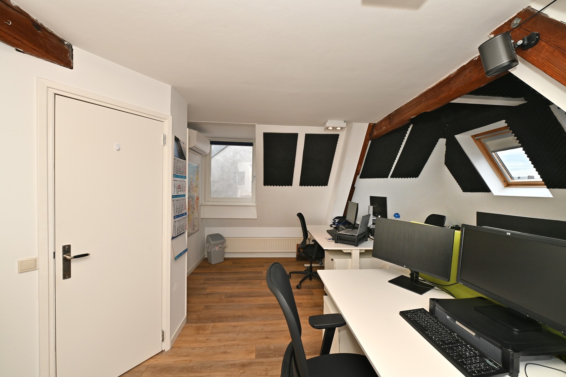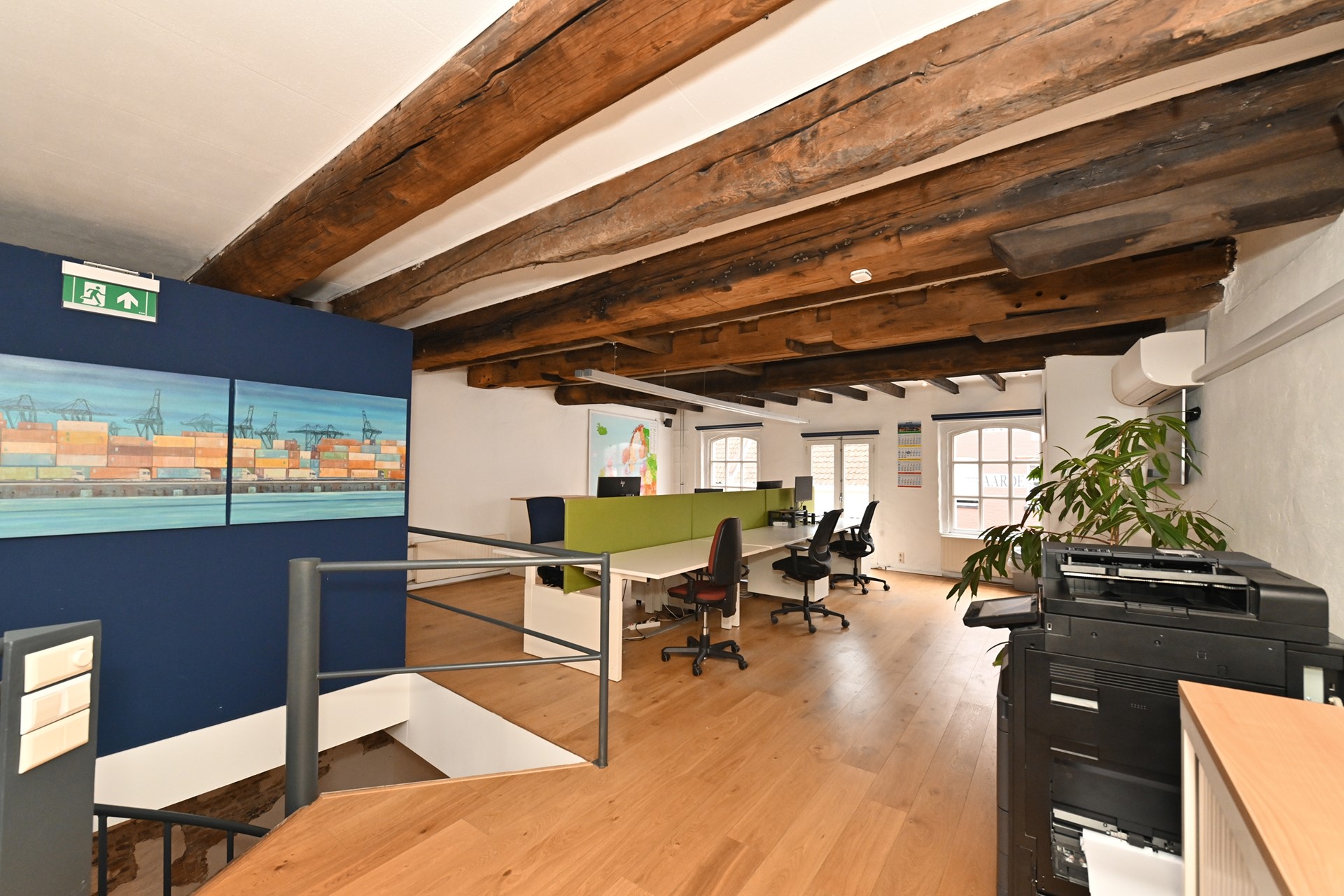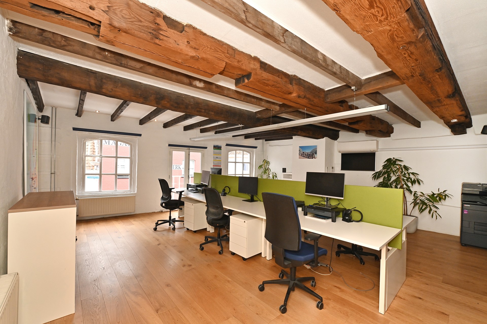 Grote open ruimte met airco, open haard (sier- of functioneel), houten balkenplafond, in gebruik als kantoorruimte maar perfect in te richten als woonkamer of teamruimte
