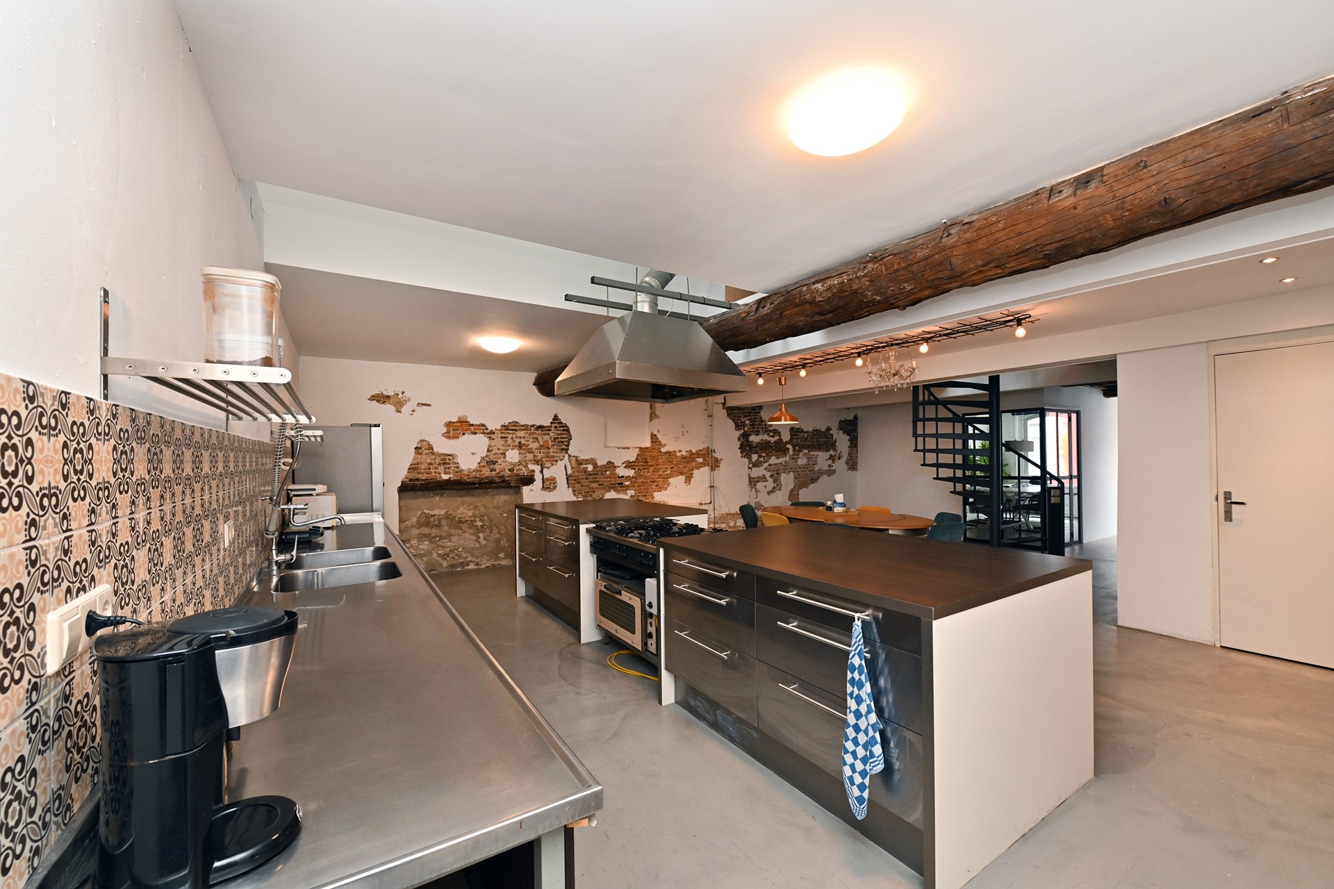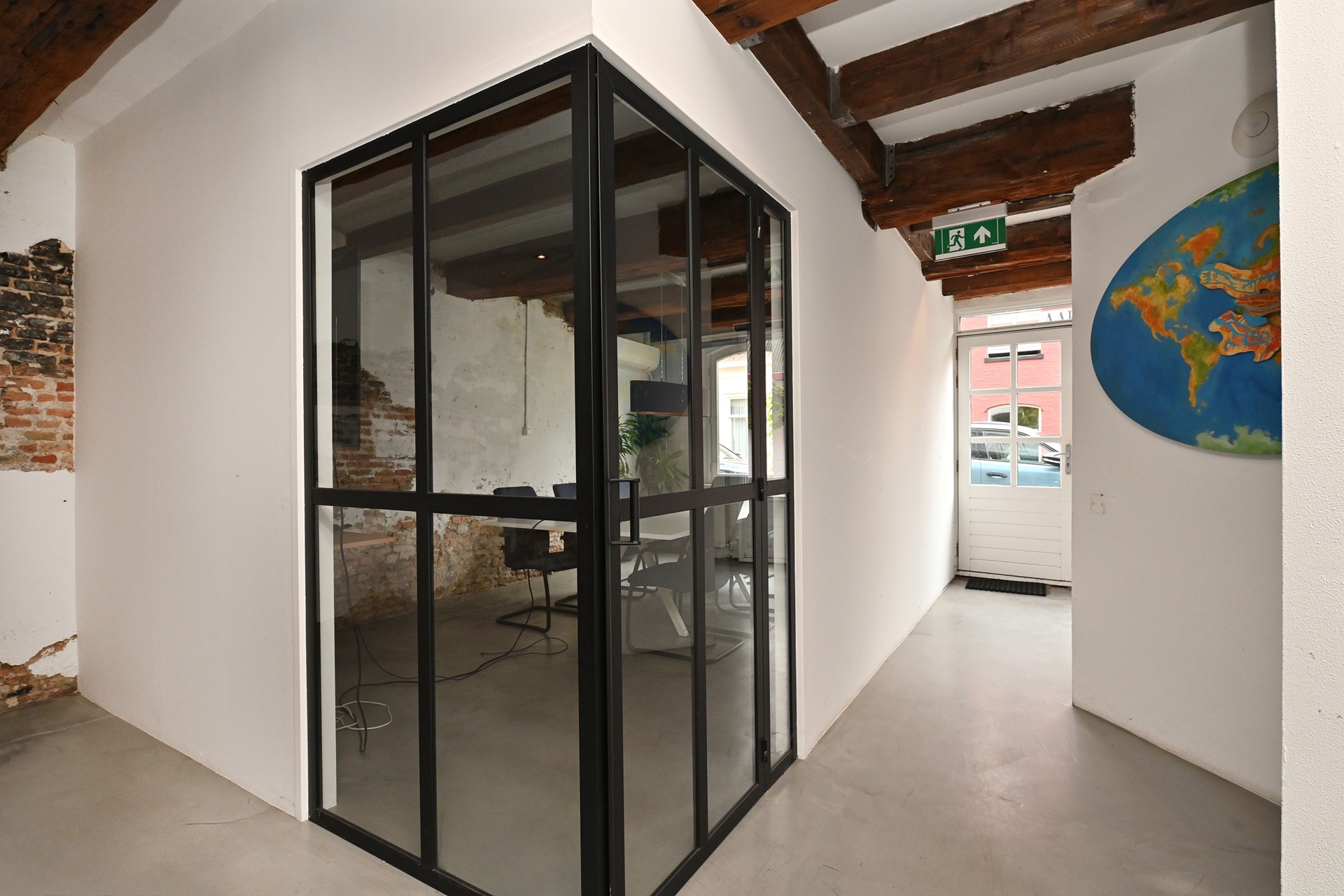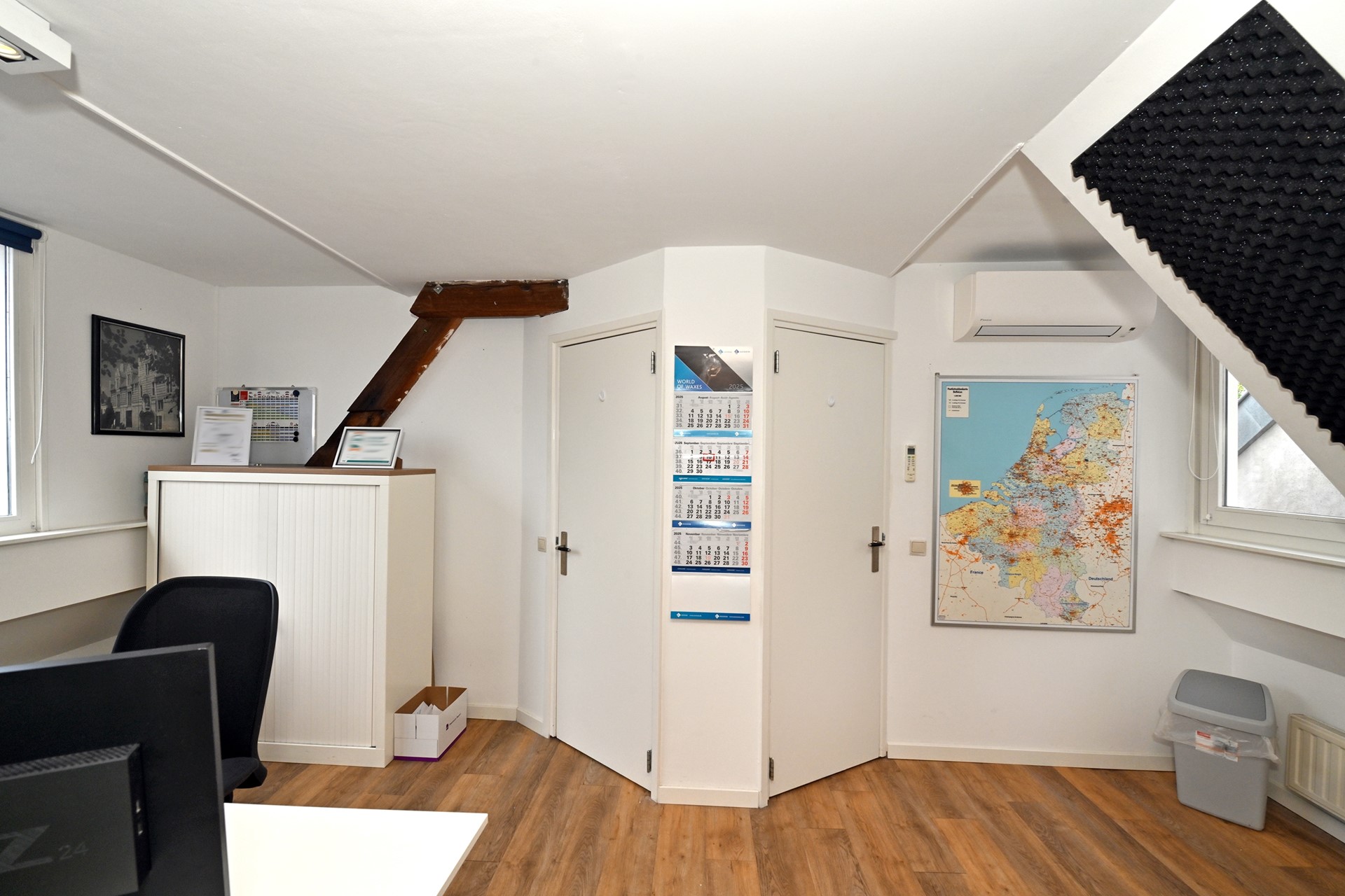 Grote open ruimte met airco, open haard (sier- of functioneel), houten balkenplafond, in gebruik als kantoorruimte maar perfect in te richten als woonkamer of teamruimte