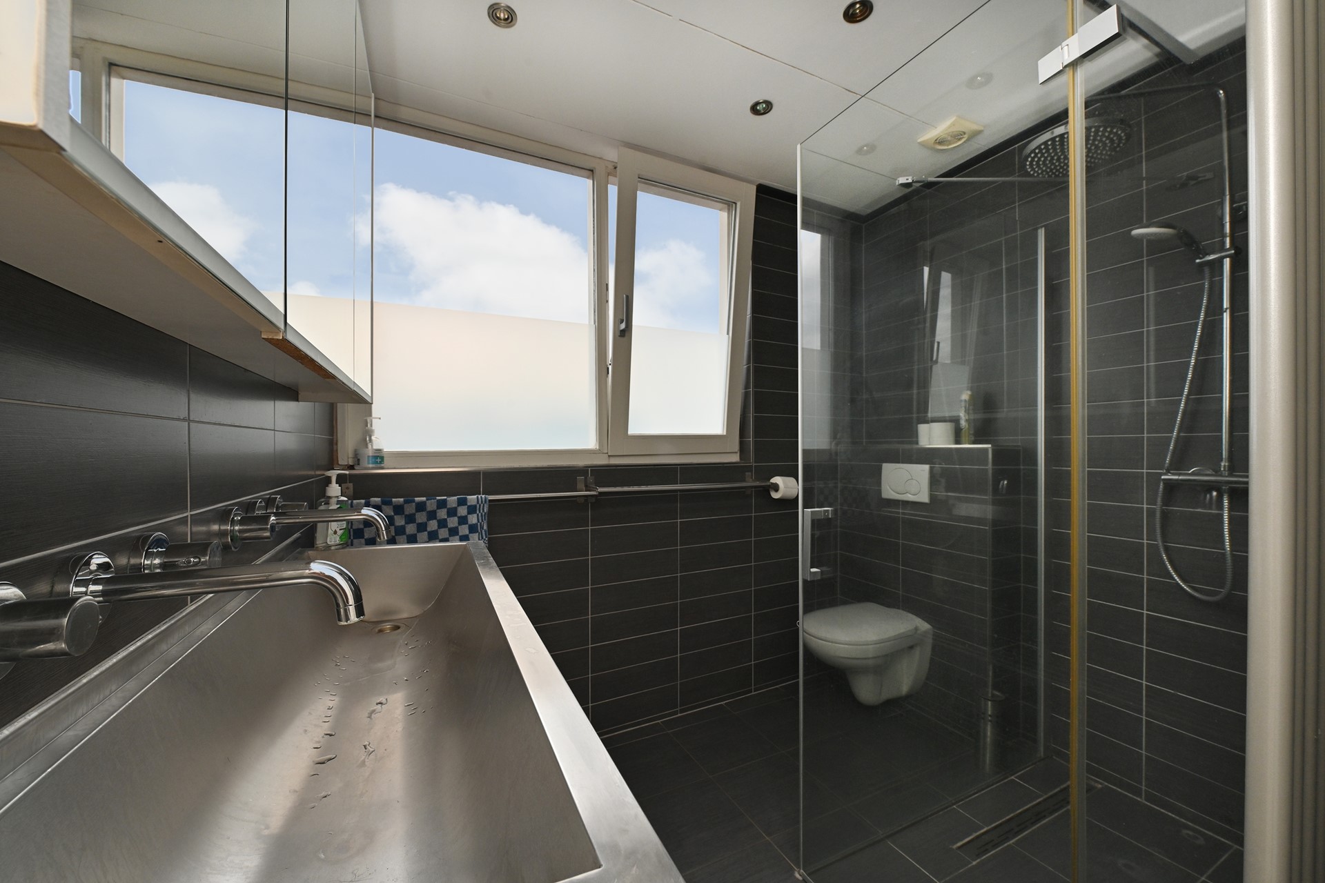 Tweede badkamer met dubbele wastafel, douche en toilet