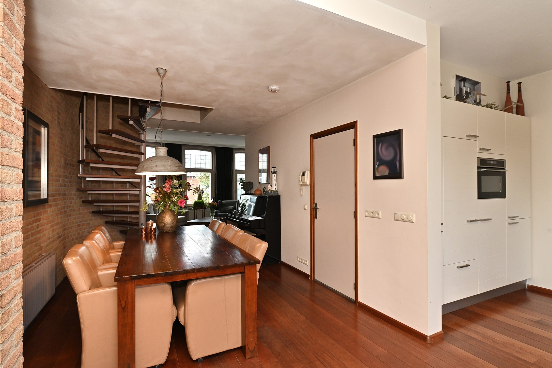 De woonkamer en keuken staan in open verbinding met elkaar en zijn afgewerkt met een massiefhouten parketvloer, metselwerkwanden en een gestuct plafond met inbouwverlichting. De woonkamer beschikt over een open haard en geluidsisolerende ramen aan de straatzijde, wat zorgt voor rust en comfort.