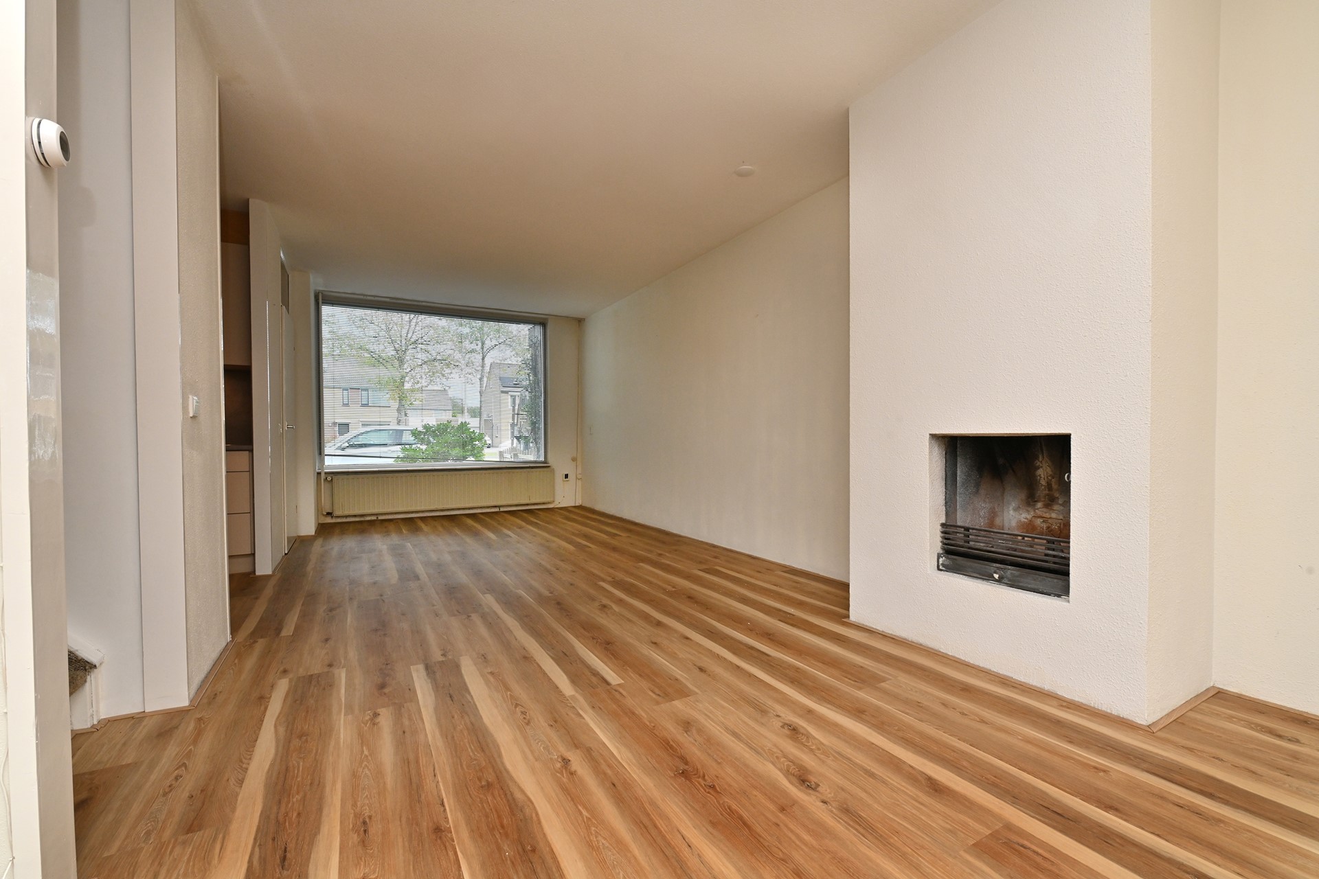 De woonkamer is licht en ruim en beschikt over een pvc-vloer, spuitwerkwanden en een spuitwerkplafond. Blikvanger is de sfeervolle schouwpartij met open haard. De trap naar boven is centraal in de kamer gepositioneerd en geeft een speels effect aan de ruimte.
