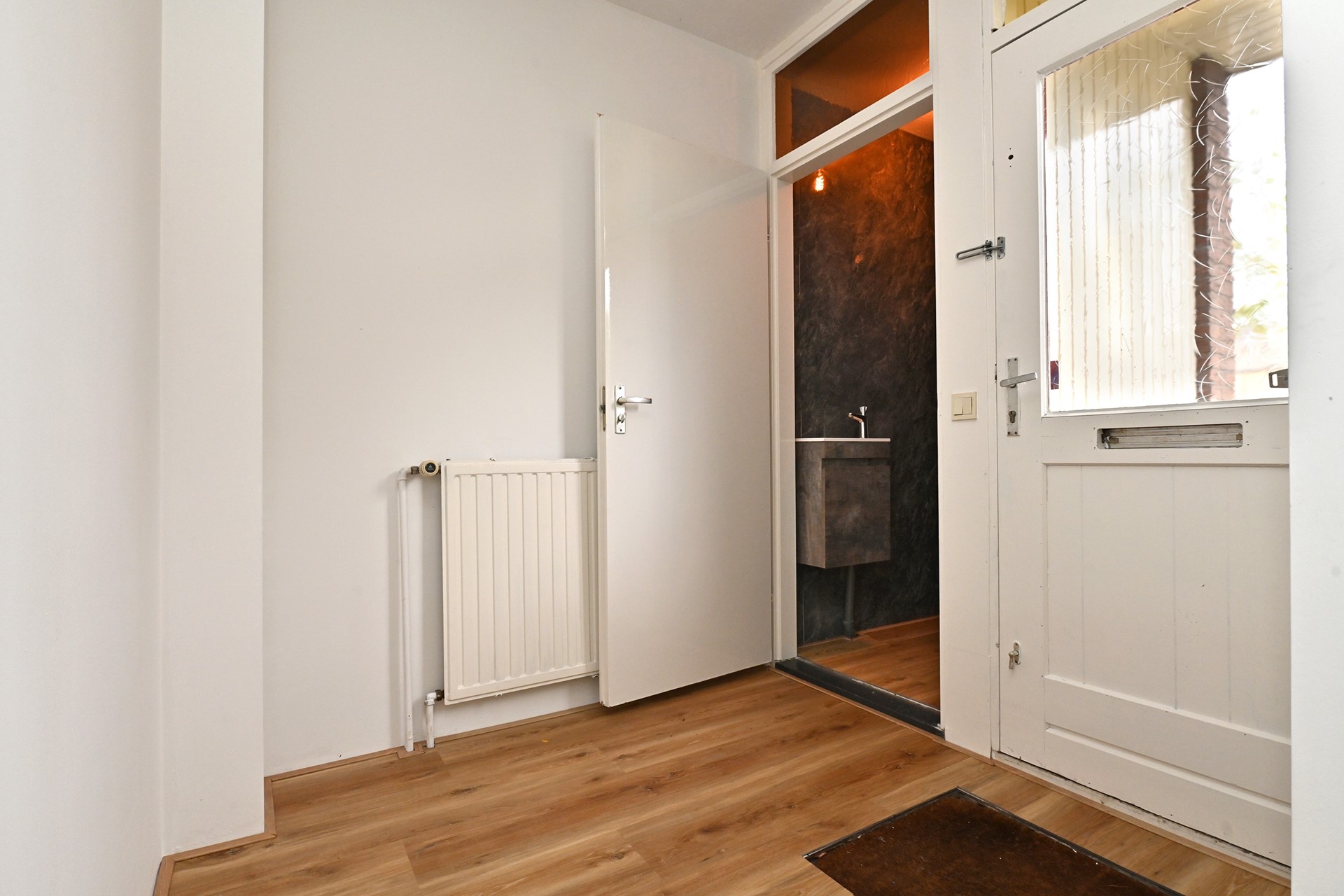De hal is voorzien van een nette pvc-vloer, strak gestucte wanden en een spuitwerkplafond. Hier bevinden zich de meterkast, het toilet met fonteintje, en de toegang tot de woonkamer.