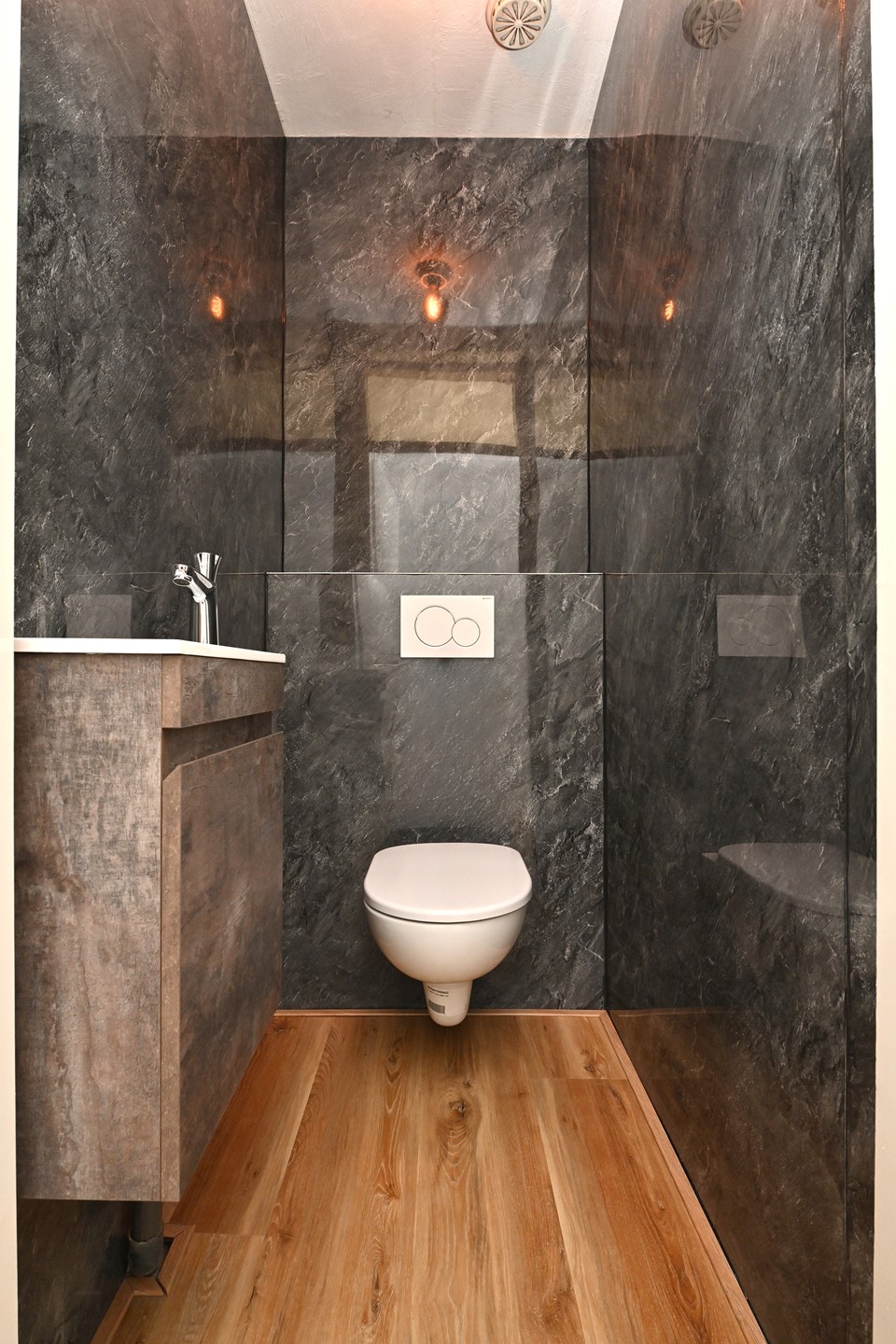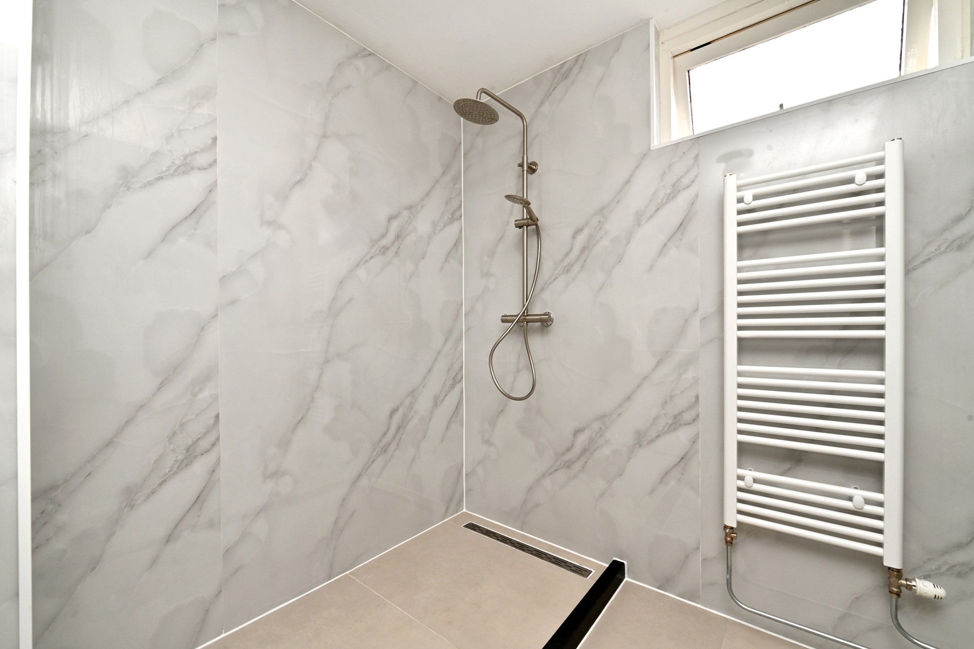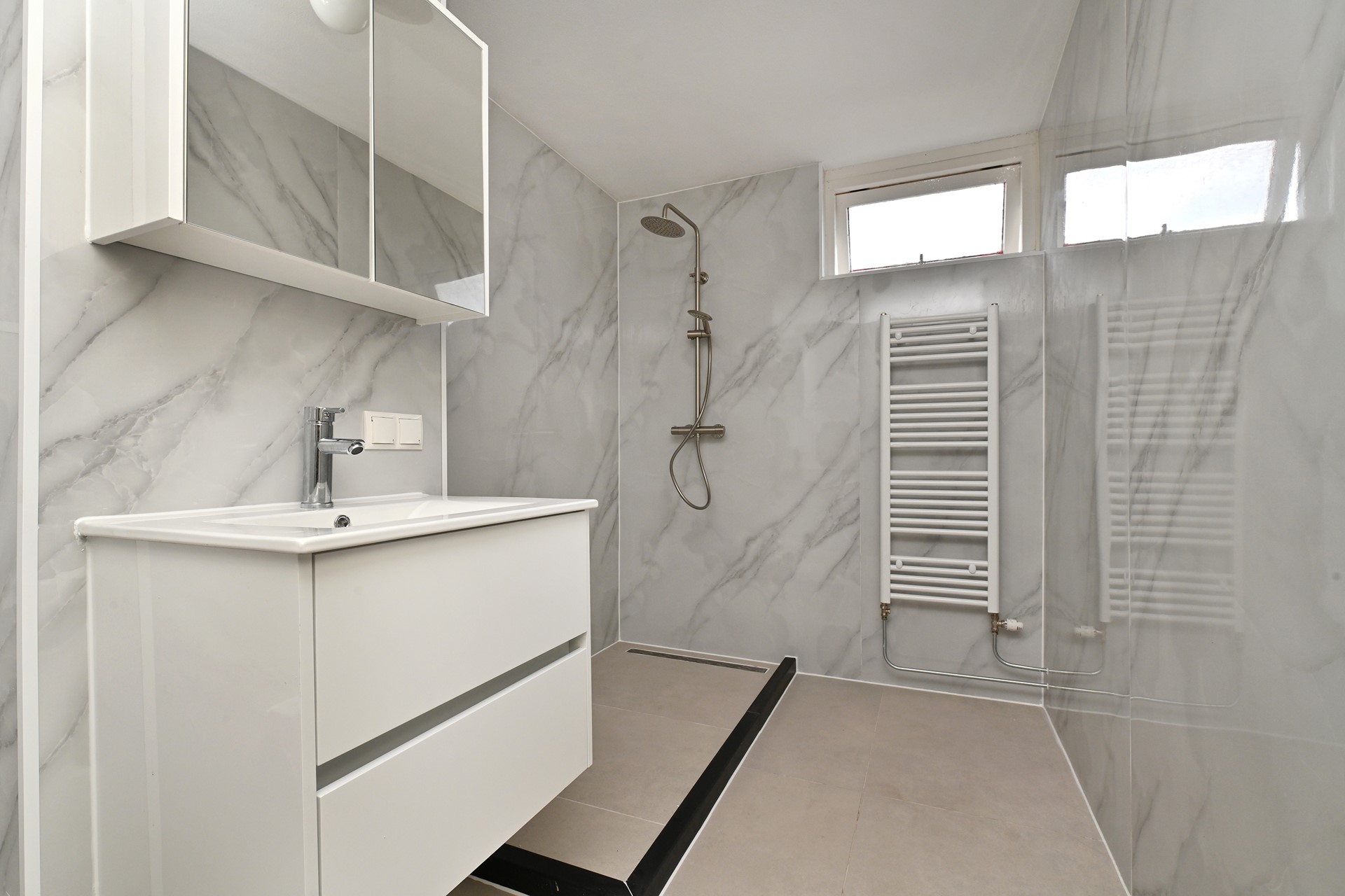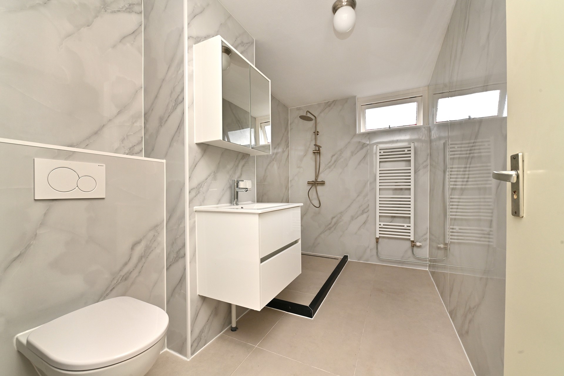 De badkamer is betegeld en beschikt over kunststof wandpanelen, een tweede toilet, een douche, wastafelmeubel, spiegelkast en een designradiator. Het plafond is afgewerkt met spuitwerk.