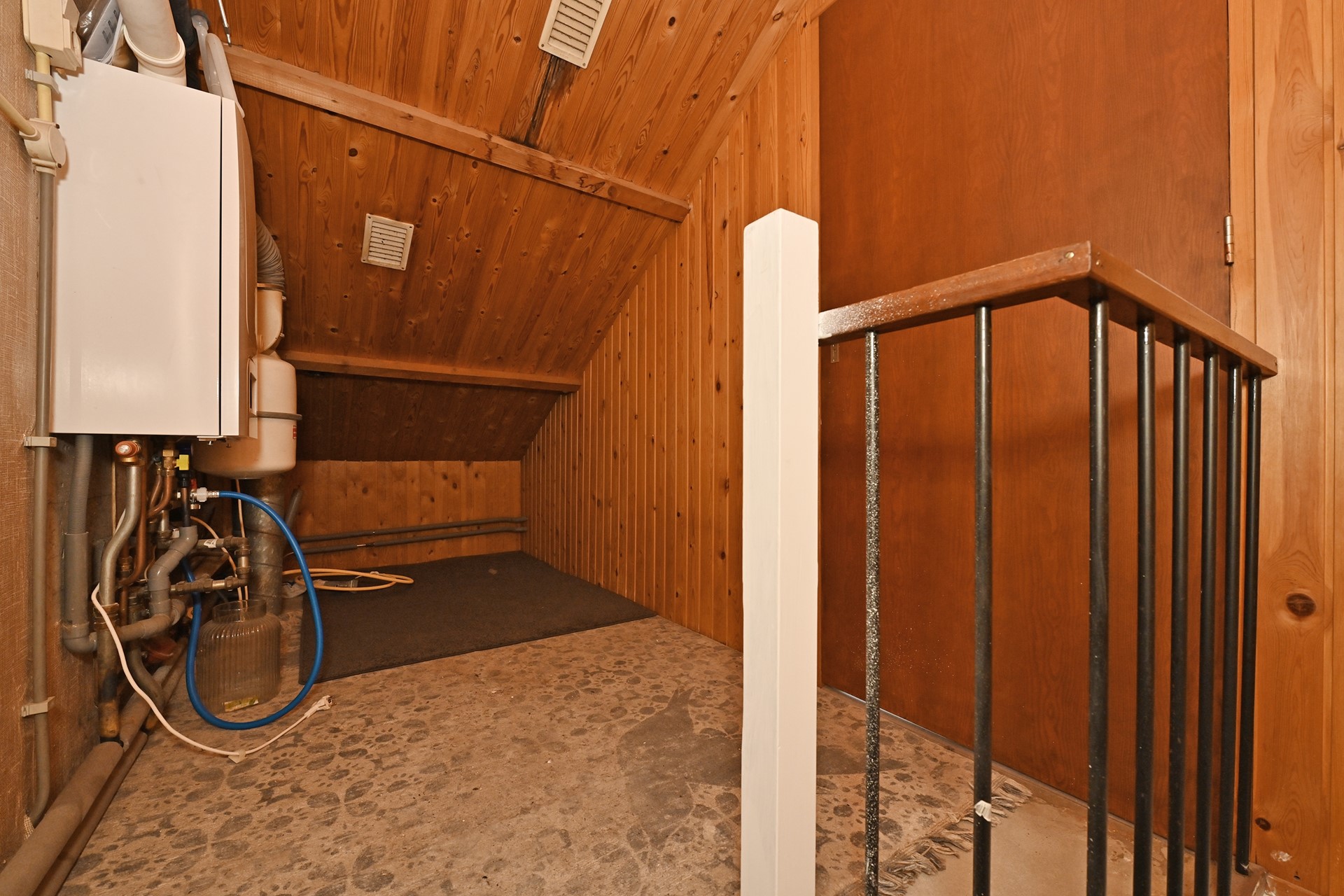 De voorzolder is afgewerkt met houten schrootjes op de wanden en het plafond, en heeft vloerbedekking. Hier bevindt zich de recent geplaatste C.V.-installatie (Remeha, 2022).