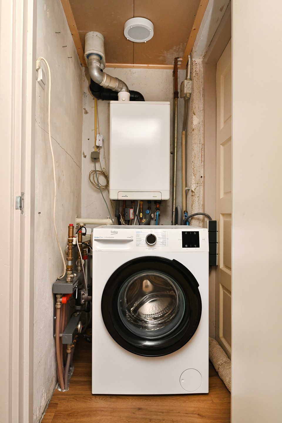 In de cv-/technische ruimte bevinden zich de Intergas HReco 36 CW5 combiketel, de vloerverwarmingsverdeler (Comap), de wasmachineaansluiting én een extra achterdeur naar de tuin.