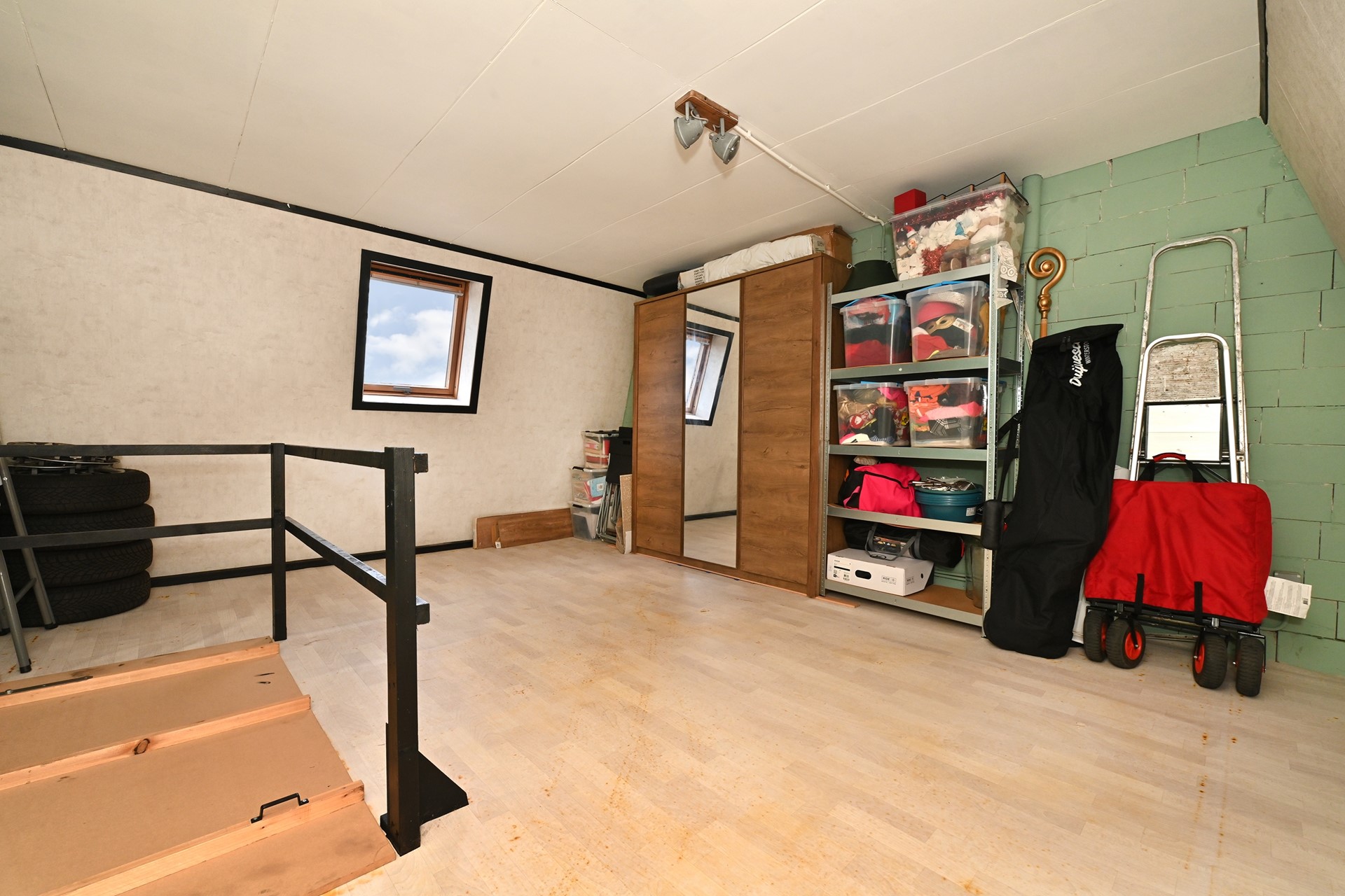 Via een vaste trap is de eerste verdieping bereikbaar, die volledig is geïsoleerd en voorzien van een dakraam en elektra. Dankzij de voorzieningen is deze ruimte uitstekend inzetbaar als salon aan huis, hobbyruimte of kleinschalige werkplek.